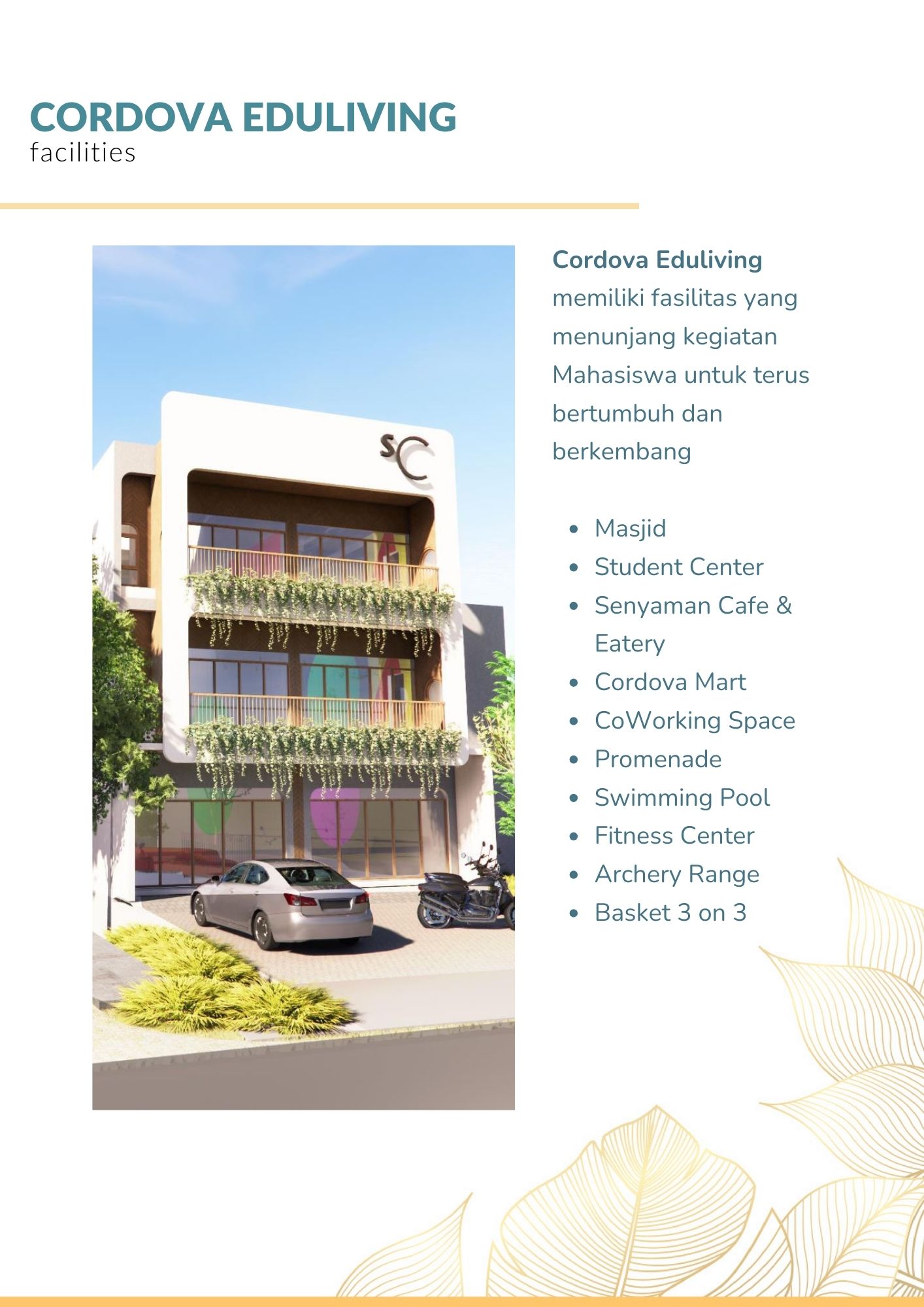 Didesain dengan fasilitas eksklusif untuk mendukung gaya hidup co-living modern. Masjid untuk sarana beribadah, Student Center sebagai communal space untuk berkumpul, sarana olah raga yang lengkap dan